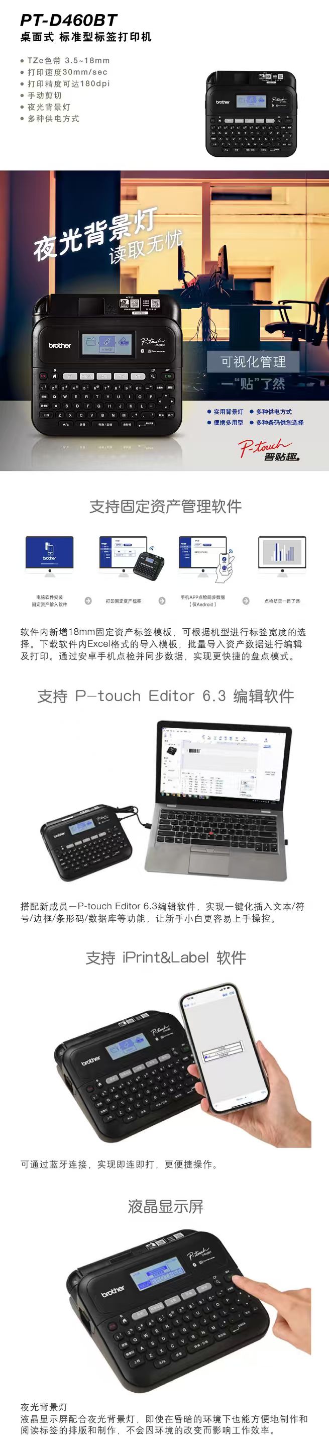 条码打印机>兄弟(brother)PT-D610BT/460BT手持便捷式标签机 线缆网络布线通信线缆打签机 蓝牙连接 固定资产 不干胶打印机 D460BT标配 USB接口可打18mm宽